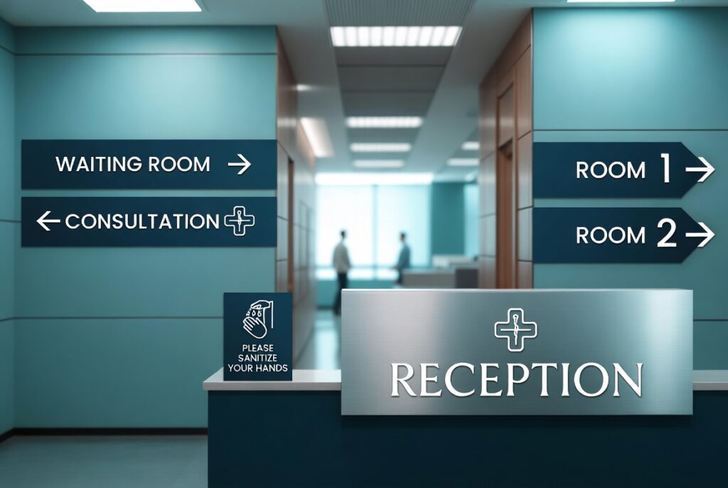 Professional interior and exterior signage that improves patient navigation and reinforces your brand. We design reception signs, directional signs, room identifiers, wall graphics, and hygiene signage with a clean, calming, and accessible design suitable for medical spaces.